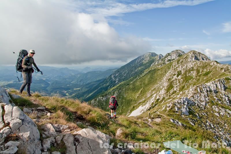 La pareja de polacos son los primeros en partir. Poco a poco los veo alejarse cargados con sus pesadas mochilas por el estrecho sendero que recorre la cresta. Van provistos de livianos bastones retráctiles de trekking, que facilitan el paso descargando parte de las fuerzas que deben realizar las extremidades inferiores en terrenos accidentados. Termino de desayunar y recojo los bártulos; es hora de ponerse en marcha.