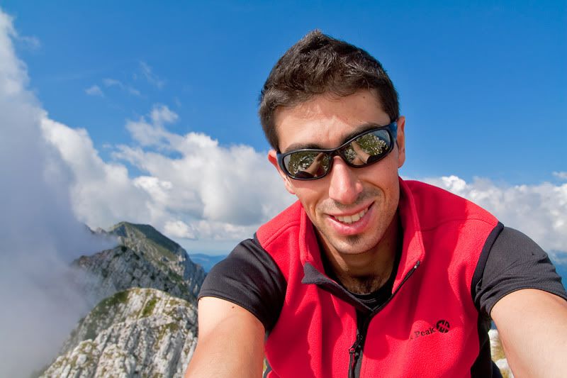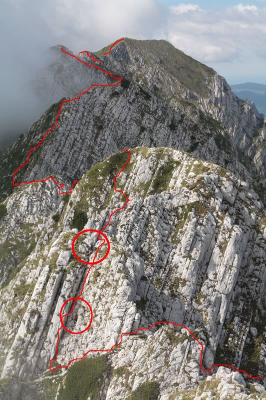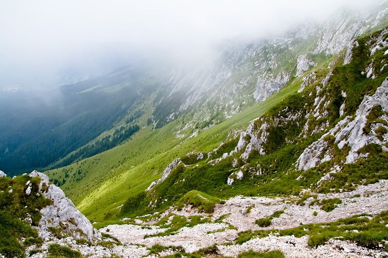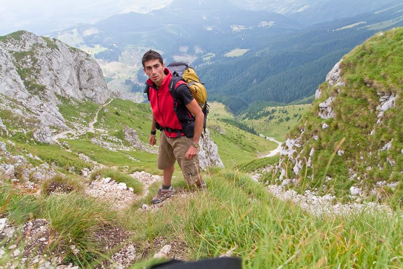 Los primeros metros son cómodos a lo largo de un estrecho sendero que se deja intuir en lo alto de la herbosa cresta. Sin embargo, a lo lejos distingo a los dos polacos subiendo en fila por un angosto canal abierto en la pared de la montaña y que bordea parte de una cresta que en ese tramo aparenta ser infranqueable. Con la fuerte pendiente, una caída podría resultar fatal, pero ellos realizan la trepada con aparente paso experto y seguro. Es parte del camino a seguir hasta alcanzar la cima de La Ohm, con continuas trepadas y bajadas en la vasta cresta de la cordillera de Piatra Craiului. A su derecha, un escarpado precipicio asoma sobre los verdes y profundos valles del sur transilvano y una sensación de inquietud recorre mi cuerpo en ese mismo instante. El pequeño ángel cuerdo que cada uno de nosotros lleva en su interior sale a animarme a dar media vuelta, deseoso de perder de vista aquel escabroso recorrido, buen conocedor de que no hemos venido a este viaje a ello. Es, sin embargo, la parte más aventurera de mí la que me anima a seguir en un eterno afán de buscar nuevas sensaciones.