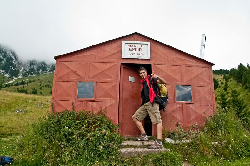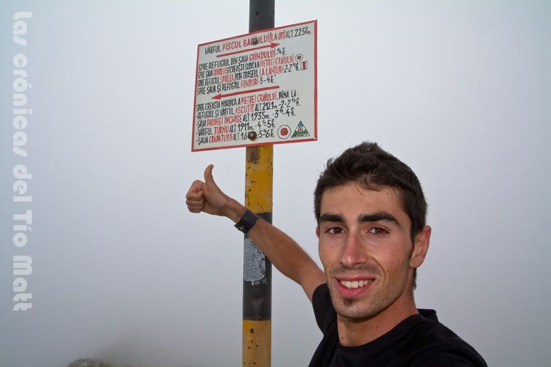 Tras algo más de dos horas de arduas y continuas trepadas y bajadas finalmente alcanzo la cima de La Ohm. Una densa niebla ha vuelto a cubrir de oscuridad la montaña con lo que sólo alcanzo a distinguir el cartel indicador de tiempos y recorridos que se sitúa sobre un gran poste de color gualdinegro: «Varful Piscul Baciului (La Ohm) Alt. 2237 m.», dice. Orgulloso abro la mochila, me visto con algo de ropa de abrigo y busco la cámara de fotos para poder visualizar el recorrido a seguir en dirección al Refugio Grind, una pequeña y vieja cabaña de pastores en el camino que me deberá llevar a la pequeña localidad de Sirnea siguiendo una ruta señalizada con la marca de un cuadrado con franjas verticales rojiblancas.