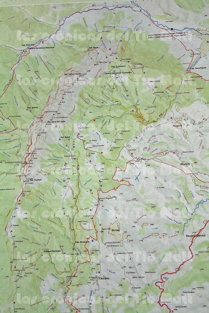 La menor de ellas me acompaña hasta una pequeña tienda de alimentación donde con su ayuda compro algo de chocolate, miel y frutos secos que me ayudarán a aportarme la energía necesaria. Nada más despedirme de ella, a la salida del pueblo un cartel indicador del Parque Nacional muestra un enorme mapa con varios recorridos señalizados y la situación de los refugios y cumbres más características. A diferencia de España, donde los senderos se distinguen entre PR y GR seguidos de un número, en Rumania es característico señalizar cada uno de los recorridos mediante un símbolo diferenciado, de forma que únicamente tienes que limitarte a seguir dicho símbolo para alcanzar el destino deseado. Saco una foto al mapa completo para poder visualizarlo en la pantalla de la cámara en caso de ser necesario.