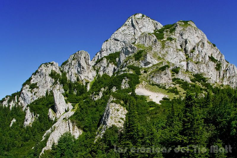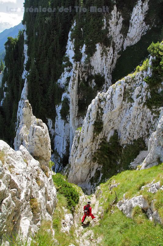Nada más dejar atrás Curmatura el agradable sendero deja paso a un terreno de fuerte pendiente en el que, entre canchales y grandes bloques calizos salpicados de abetos que intentan aferrarse a los mismos como buenamente pueden, se va ganando altura ayudado a ratos por cadenas fijadas a la roca. El subidón de adrenalina es tremendo al atravesar los pasos aéreos que debo cruzar en el camino, a la vez que disfruto de las sobrecogedoras vistas que el paisaje me ofrece. Me asomo a un saliente, tomo aire y observo la grandiosidad de aquel paraje.