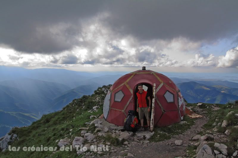 La cresta no presente ninguna dificultad técnica hasta el refugio Varful Ascutit al que me dirijo. Camino ágil entre punzantes setos que me provocan algún que otro arañazo en las piernas siguiendo las marcas indicativas del recorrido sin poder evitar observar el fascinante abismo que asoma a cada uno de los costados. A lo lejos ya vislumbro la forma esférica de lo que será mi hogar durante la fría noche que se avecina. Oscuros nubarrones, presagio de un cambio de tiempo, crecen sobre mi cabeza mientras apuro los últimos metros. Por fin, alcanzo mi objetivo; un pequeño refugio metálico de varias piezas pentagonales entre las que se alterna alguna de forma hexágonal, formando entre todas ellas una semiesfera de color pardo. La austera superficie interior no debe de ser mayor a los 6 metros cuadrados, disponiendo de varios cristales rayados a través de los cuales apenas logra verse nada hacia exterior. La entrada está formada por una chirriante y enmohecida puerta metálica, que apenas aísla del frio aire de fuera, así como por una gran palanca que hace las funciones de improvisado pestillo. En el exterior de la puerta, pintado con grandes letras, se muestra el nombre del refugio: Refugiul Vf. Ascutit (Lehman). Una amplia chapa metálica ocupa la mitad del espacio interior a una altura aproximada de medio metro. "Supongo que esto será donde me tocará dormir" - pienso.