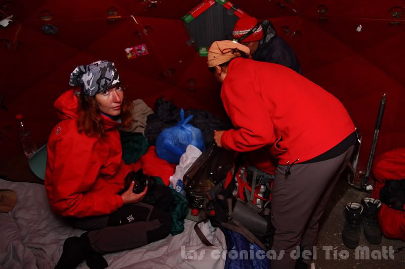 Poco después, un grupo de tres rumanos me sorprende en el interior del refugio; son un matrimonio y su hija. No presentamos y intercambiamos algunas palabras, especialmente con la hija, con la que mantengo una agradable conversación sobre fotografía, a la cual es aficionada. Me sorprende su equipación, ataviados todos ellos con ropa de invierno y piolets, a diferencia de mis prendas veraniegas que no dejan de ser algo de ropa básica de montaña complementada con ropa de calle. Por un instante me siento ridículo vestido con varios niquis bajo un chaleco, cubierto todo ello con la chaqueta de calle que me he puesto para abrigarme del frío que a cada minuto se hace más intenso. "¿Qué pensarán de mí? - me digo a mí mismo -. Bueno, es lo que hay, subir montañas no estaba entre mis planes cuando vine a Rumania".