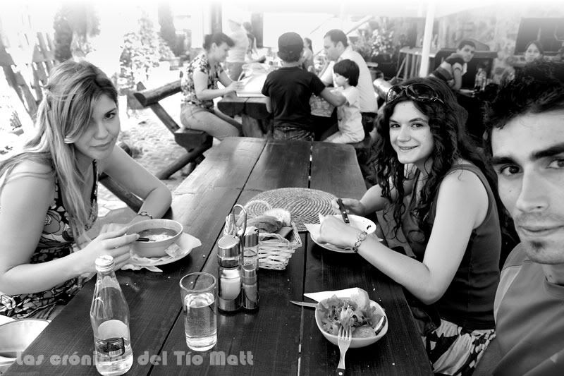 La comida la hemos realizado en la terraza de un pequeño pero coqueto restaurante cercano al castillo, en el centro del pueblo de Bran, desde donde he podido observar como el cielo azul de estos días ha dado paso a los primeros cúmulos formados por las corrientes de aire cálido ascendente. "El día amenaza tormenta", pienso. Y ha sido en esa mesa de madera, protegidos del astro rey por un tupido toldo, donde Sophie me ha enseñado a diferenciar y pronunciar en inglés el agua con gas (sparkling water) y sin gas (still water). Como dice el refrán: "nunca te acostarás sin saber algo nuevo".