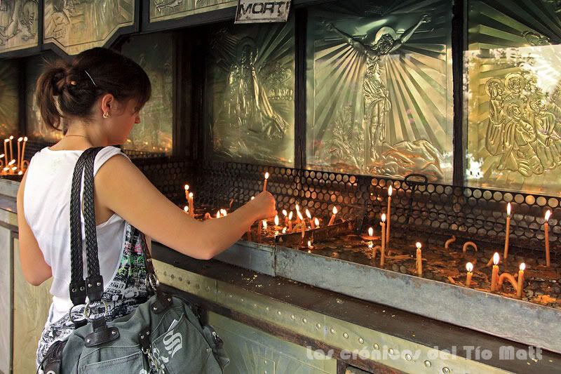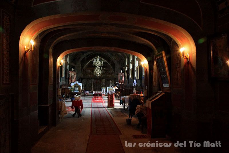 Dentro de la iglesia está prohibido fotografiar. No entiendo esa extraña manía que existe en algunas zonas de no permitir fotografiar dentro de las iglesias. Alguno me dirá que se dañan los frescos, incluso los materiales con los que fué construida, pero entiendo que mientras no se use el flash no hay perjuicio alguno. Ni corto ni perezoso, intento sacar una foto. El resultado os lo podeis imaginar: de patitas en la calle. No me he perdido gran cosa por lo menos.