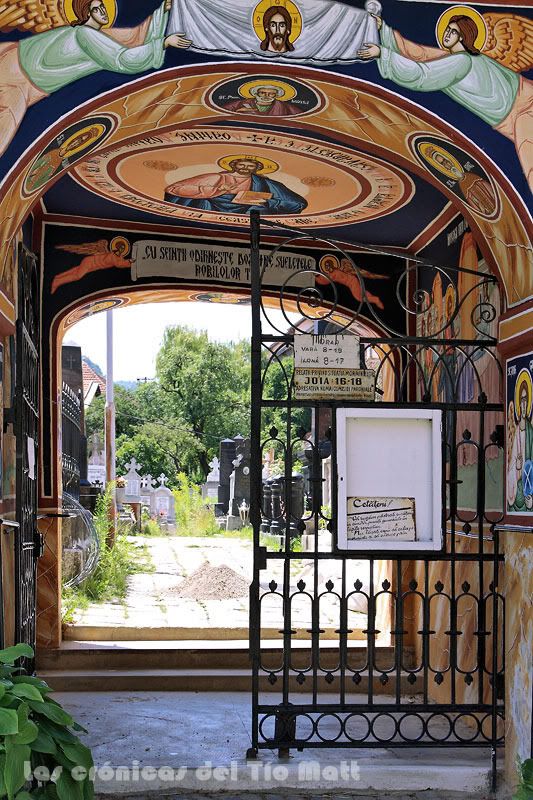 Justo en frente y dentro del recinto que que la rodea se encuentra un pequeño cementerio ortodoxo donde un joven rumano estaba preparando el terreno para lo que parecía ser una próxima inhumación. Su entrada está adornada con bonitos y coloridos frescos donde se pueden ver representados los rostros de los apóstoles y la imagen de Jesús sujetada por dos ángeles. Otro día os contaré la aventura con un jovenzuelo rumano ortodoxo que tuve en Sibiu. Pero para eso aún faltan varios días por transcurrir.