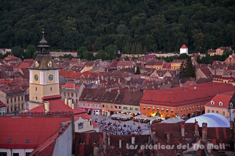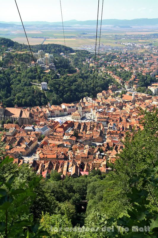 El verano rumano es caluroso como el español y son comunes los días que se sobrepasan los treinta grados centígrados, alcanzándose en ocasiones valores superiores. El día de hoy no ha sido para menos y el sol ha brillado preciso y fuerte haciendo subir el mercurio a la par que bajaba la humedad. He optado por hacer caso a las recomendaciones que me dió Janos el día anterior y he subido a lo alto del Monte Tampa, sólo que en vez de coger el teleférico como me dijo él, he optado por ascender los escasos doscientos cincuenta metros de desnivel por un sendero zigzagueante que atraviesa un frondoso bosque antes de alcanzar las enormes letras con el nombre de Brasov que coronan la colina. Aquí arriba hay un mirador donde los turistas se retratan por turnos y un restaurante coronado por una gran bandera rumana visible desde toda la localidad de Brasov.